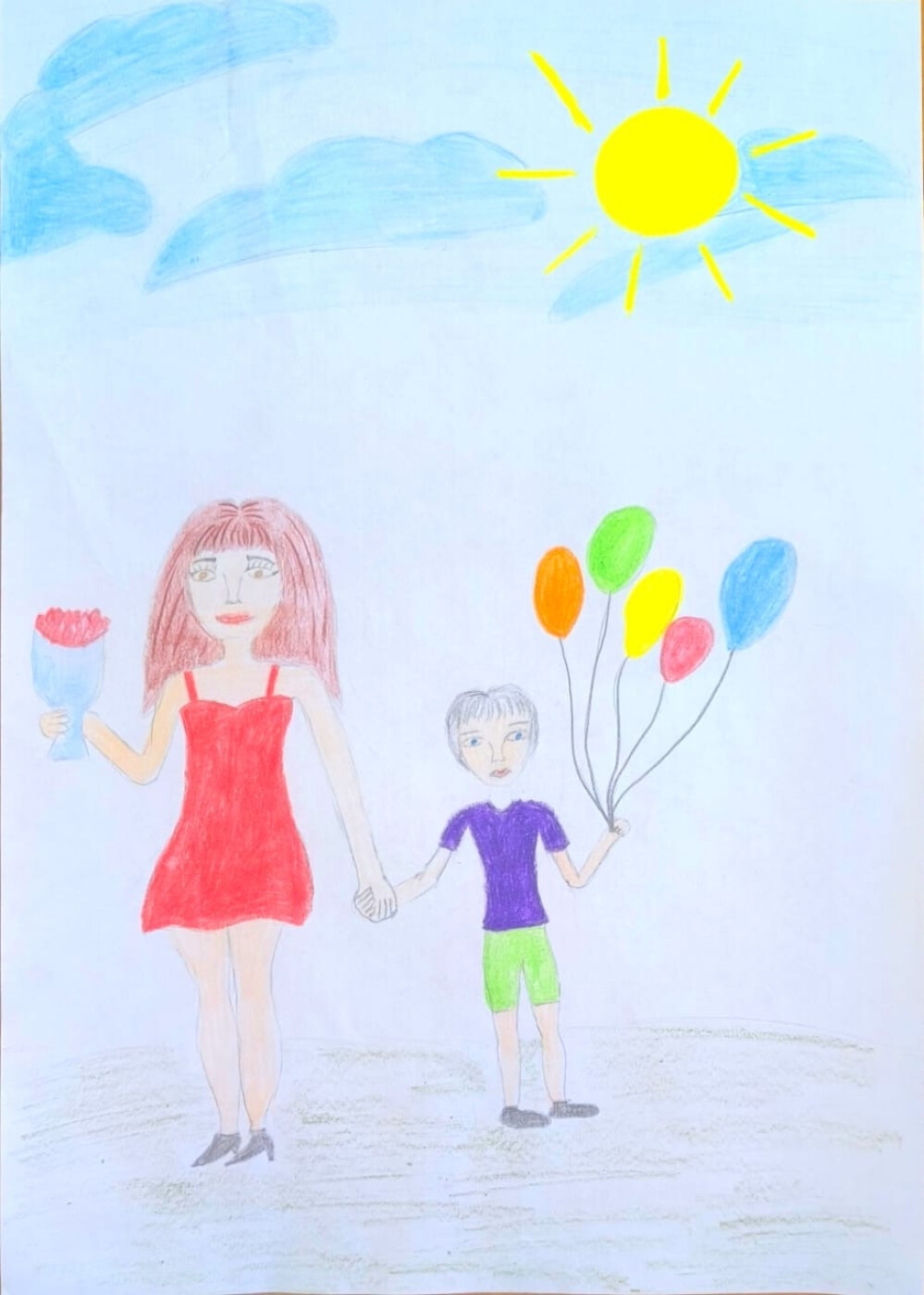 Я нарисовал себя и маму. Мы идём рука об руку, потому что я очень люблю ходить с ней рядом. У меня в руке воздушные шарики, они такие яркие и разноцветные, как радуга. Мамочке я подарил красивые цветы, потому что она самая лучшая на свете, и я очень-очень её люблю. Когда я смотрю на этот рисунок, мне становится тепло и радостно на душе.