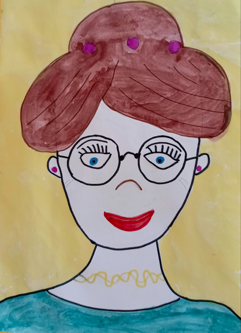 Это моя мамочка! У неё красивые коричневые волосы. Ещё у неё синие-синие глазки и очки, чтобы лучше видеть, как я играю. Я нарисовал ей красные губы, потому что она любит краситься. Ещё у мамы есть красивое жёлтое ожерелье и серёжки, и платье зелёное, как травка. А фон жёлтый, как солнышко, потому что мама – моё солнышко! Я очень люблю свою мамочку! Она самая лучшая!