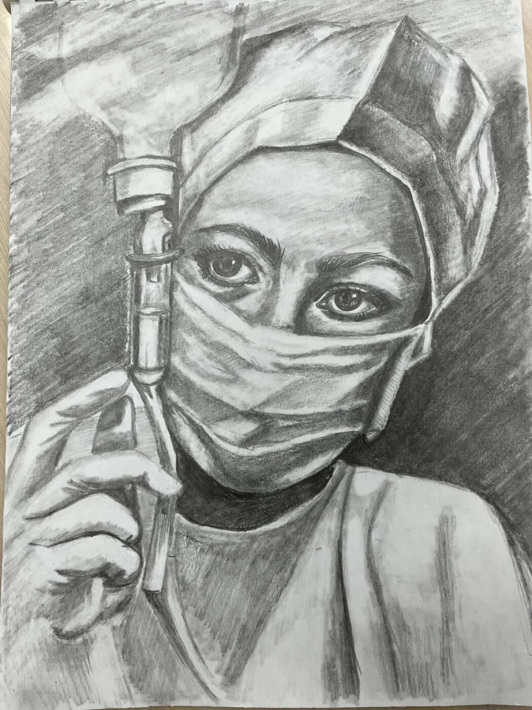 На картине изображена медсестра, которая держит в руках капельницу. Её образ символизирует заботу и профессионализм медицинского работника.