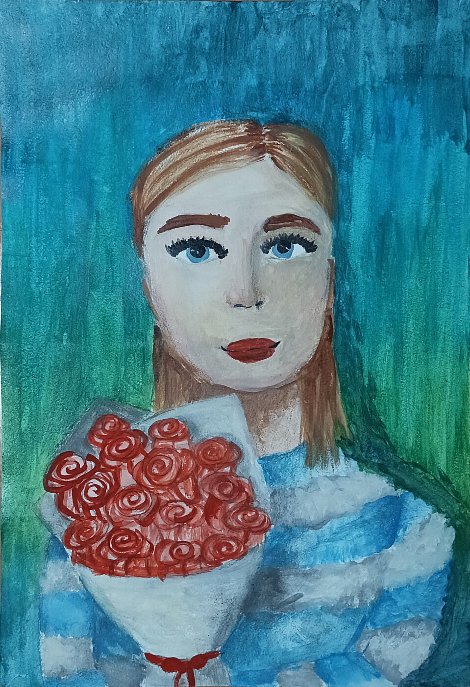 Я нарисовала свою маму с прекрасным букетом цветов. На картине она выглядит такой счастливой и умиротворённой. Этот рисунок — мой подарок для неё, чтобы показать, как я её люблю и ценю. Я вложила в него все свои чувства и эмоции. Мне хочется, чтобы каждый раз, когда она будет смотреть на этот рисунок, она вспоминала о том, как я её люблю.