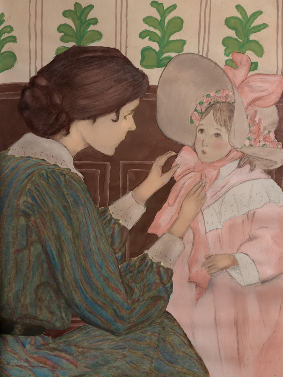 Я хотела передать на рисунке момент тепла и заботы, которую дарит нам мама. Ведь мама - это тот человек, который всегда помогает своему ребёнку, поддерживает и делает обычные моменты особенными. Здесь мама помогает дочке с образом, и в этом простом жесте - вся её любовь и нежность.