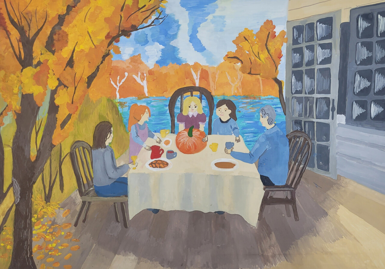 Рисунок "Семейный завтрак" выполнен в технике живопись. Краски - гуашь.