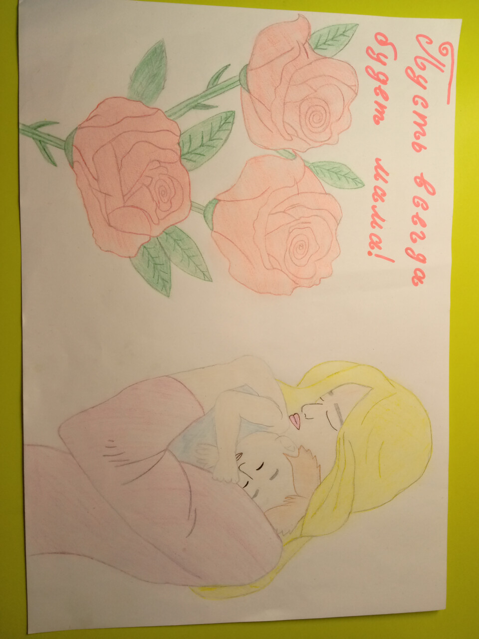 Плакат на тему ,, Пусть всегда будет мама ". Выполнен карандашами и фломастерами.