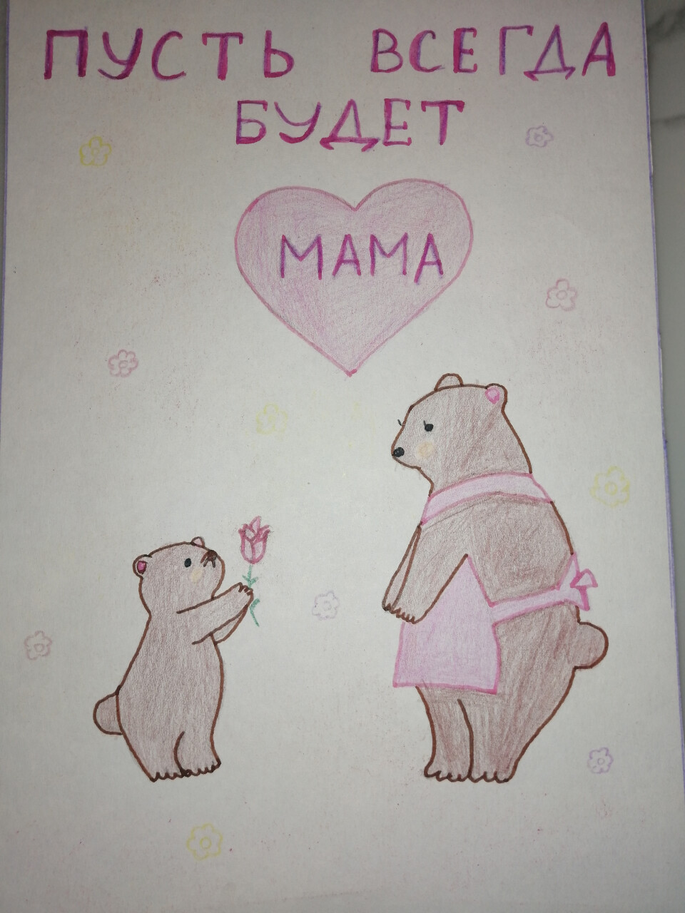 Мамочка есть у всех. Работа выполнена карандашами и фломастерами.