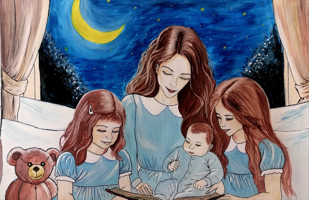 Одним уютным вечером, мама читала сказку своим любимым деткам, в небе светила яркая луна,мерцали звёздочки, а из окна виднелись немного заснеженные елочки!