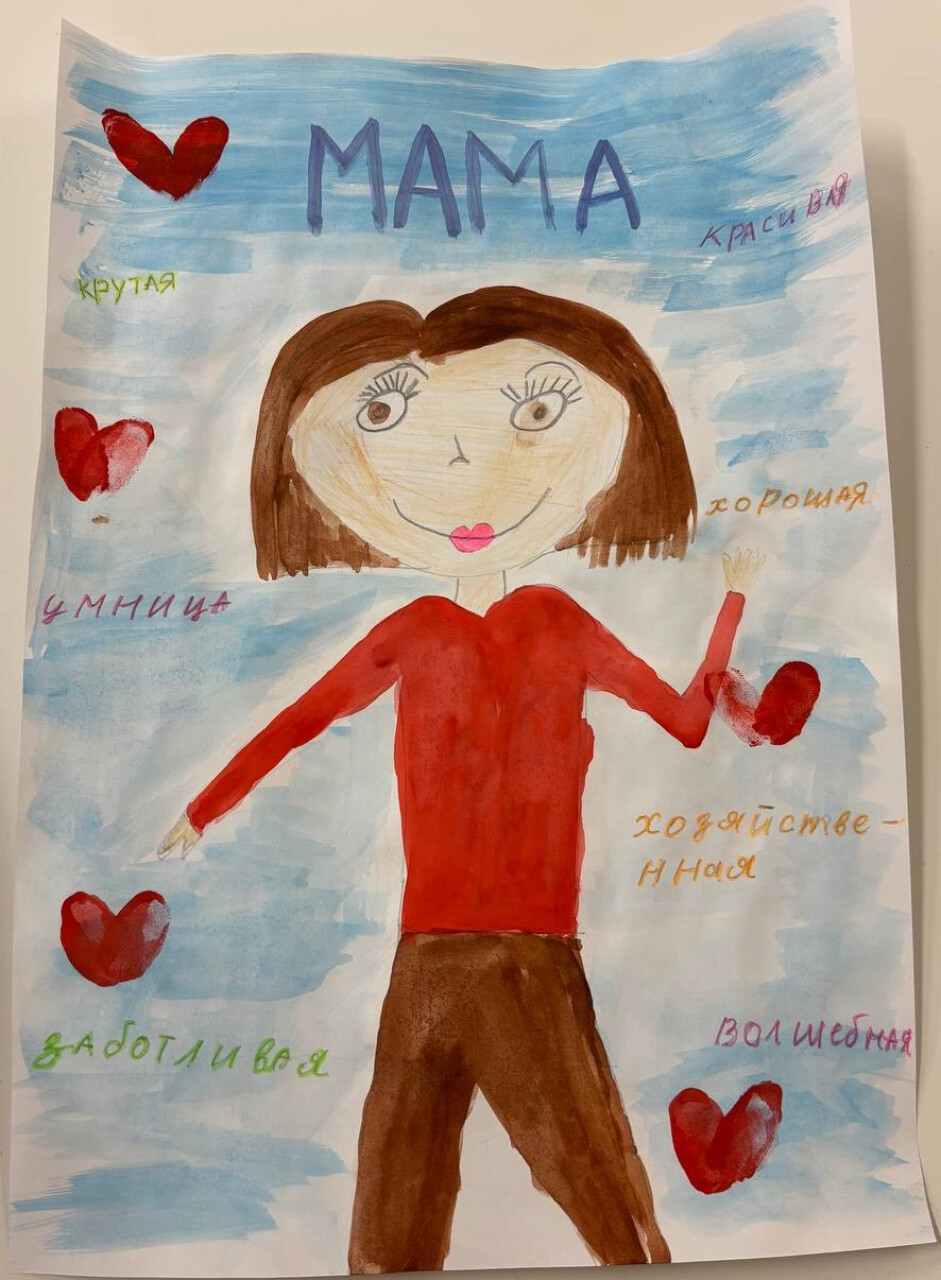 Конкурсная работа выполнена на листе формата А4. Использовались акварельные краски, гуашь, карандаши. Ребенок изобразил на рисунке свою маму, написал какая она, а также оставил свои отпечатки пальцев в форме сердец.
