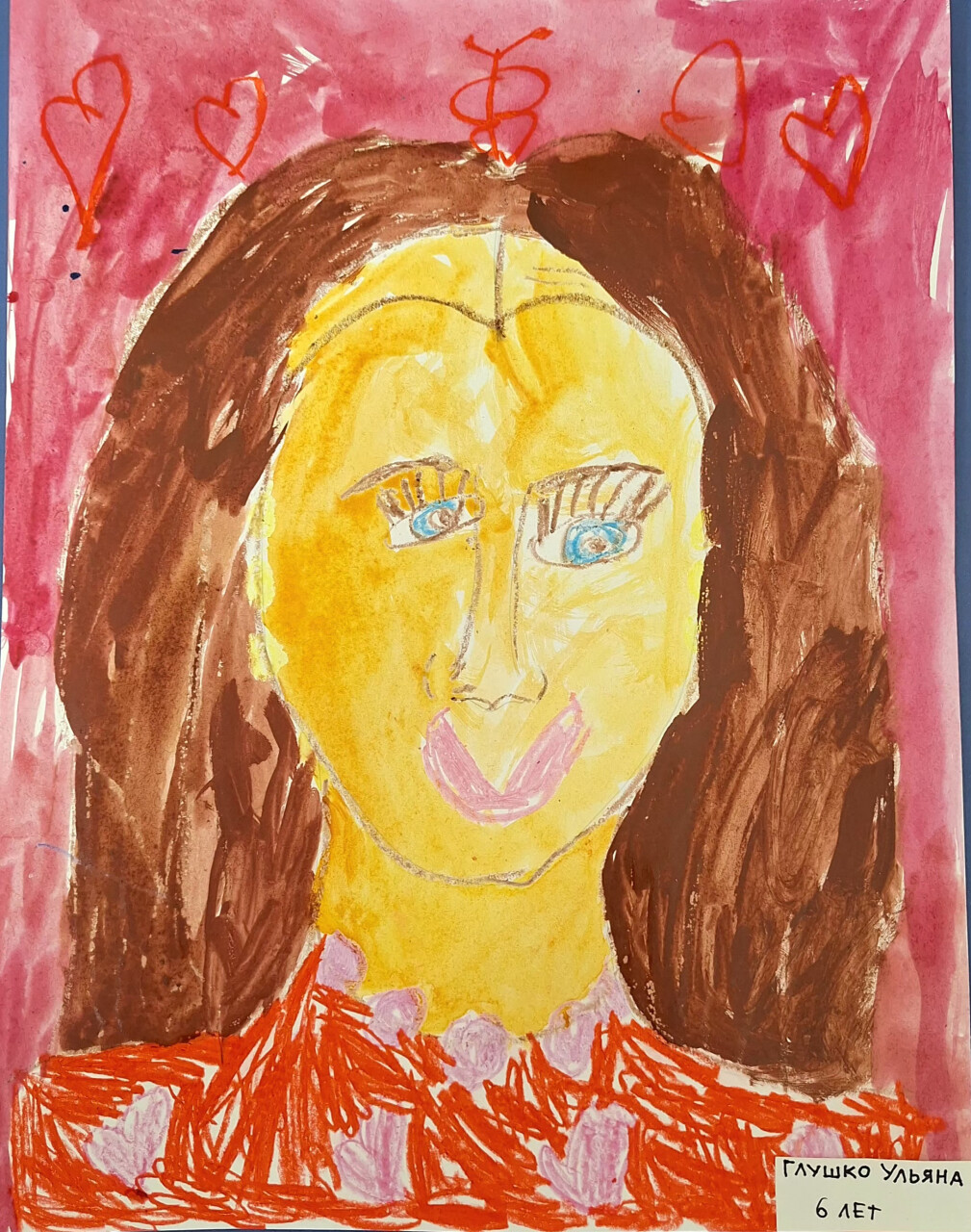Работа выполнена масляной пастелью и акварелью на ватмане формата А3. Ульяна изобразила свою маму.