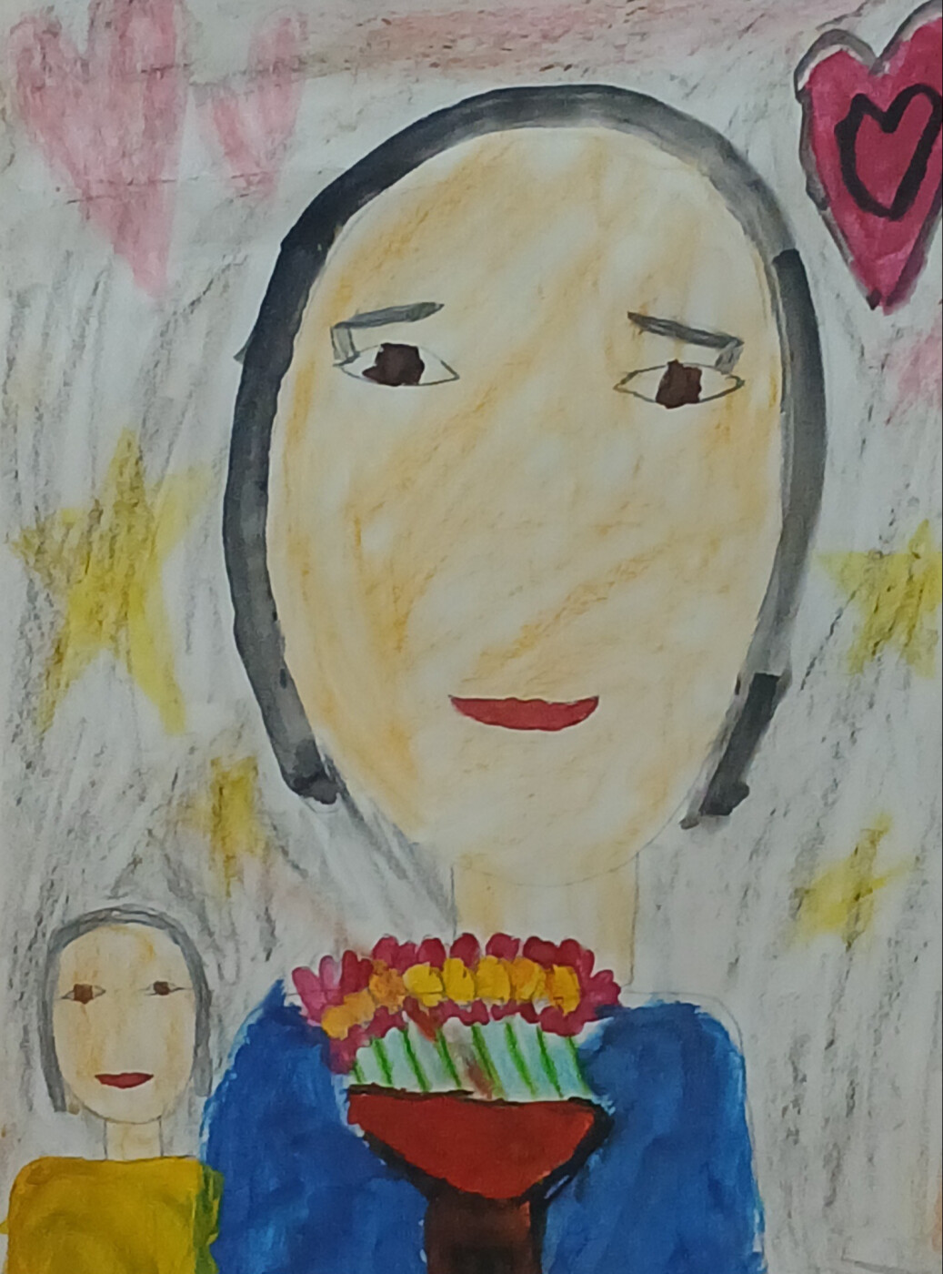 Рисунок выполнен гуашевыми красками и цветными мелками.