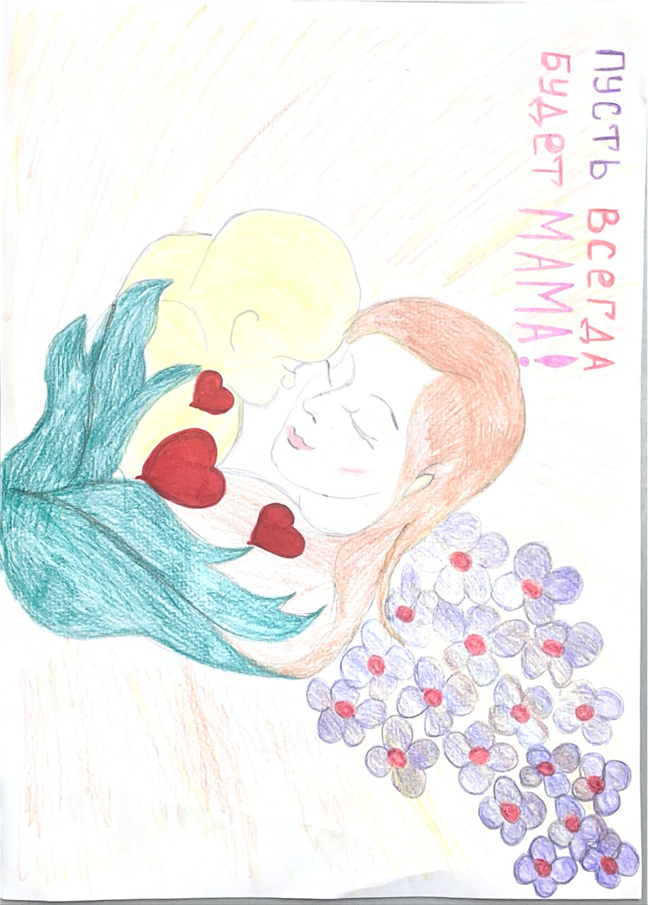 Рисунок цветными карандашами «Пусть всегда будет мама». Композиция передаёт интимный момент — ребёнок нежно касается лба матери; условные растительные мотивы и символические сердца подчёркивают тему любви и благодарности.