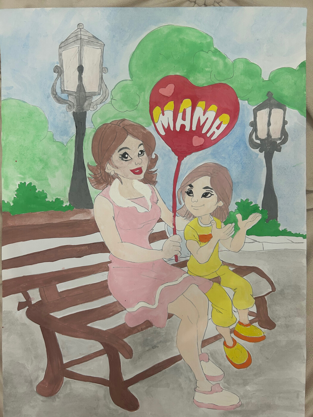На картине изображены мама и дочка, которые проводят вместе тёплый день в парке. Они сидят на скамейке, улыбаются и наслаждаются общением. В руках у девочки — красный воздушный шар в форме сердца с надписью «МАМА». Этот шарик — символ любви, доброты и нежности, которые ребёнок чувствует к своей маме.