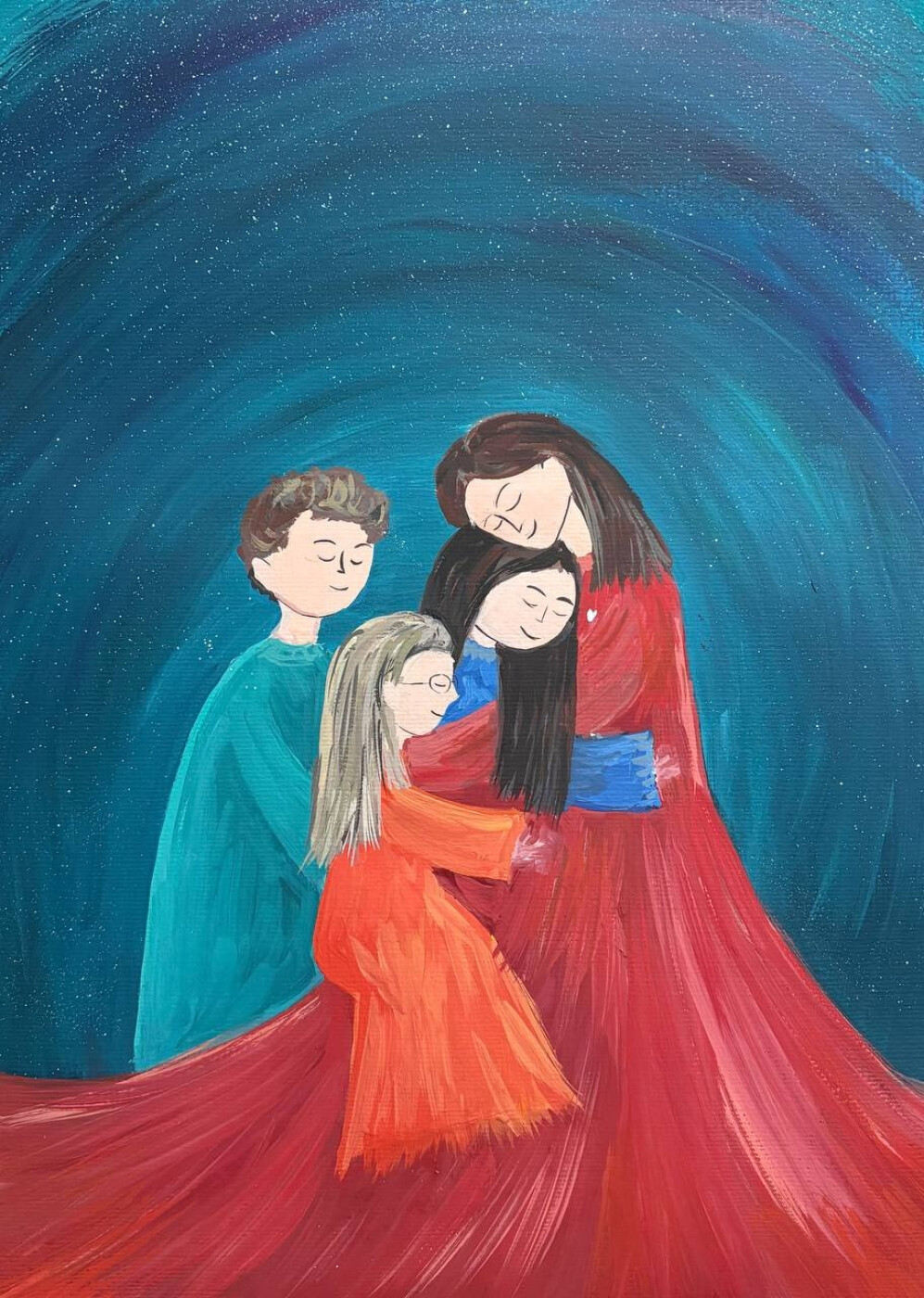 В нашей семье трое детей. Я, мой брат и сестра. Эта картина символизирует наши взаимоотношения с мамой. Ведь материнская любовь-это тепло, забота, обнимашки, когда мама рядом, поддержка, помощь, принятие, совместность и много всего еще.