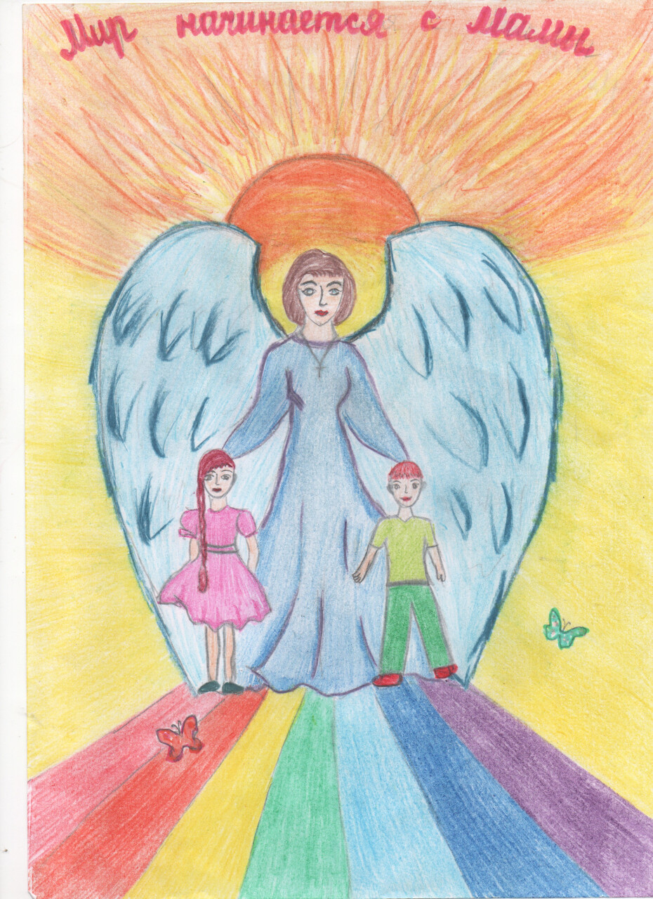 На рисунке изображена мама, как Ангел, который охраняет и защищает всех детей на Земле. Рисунок выполнен цветными карандашами.