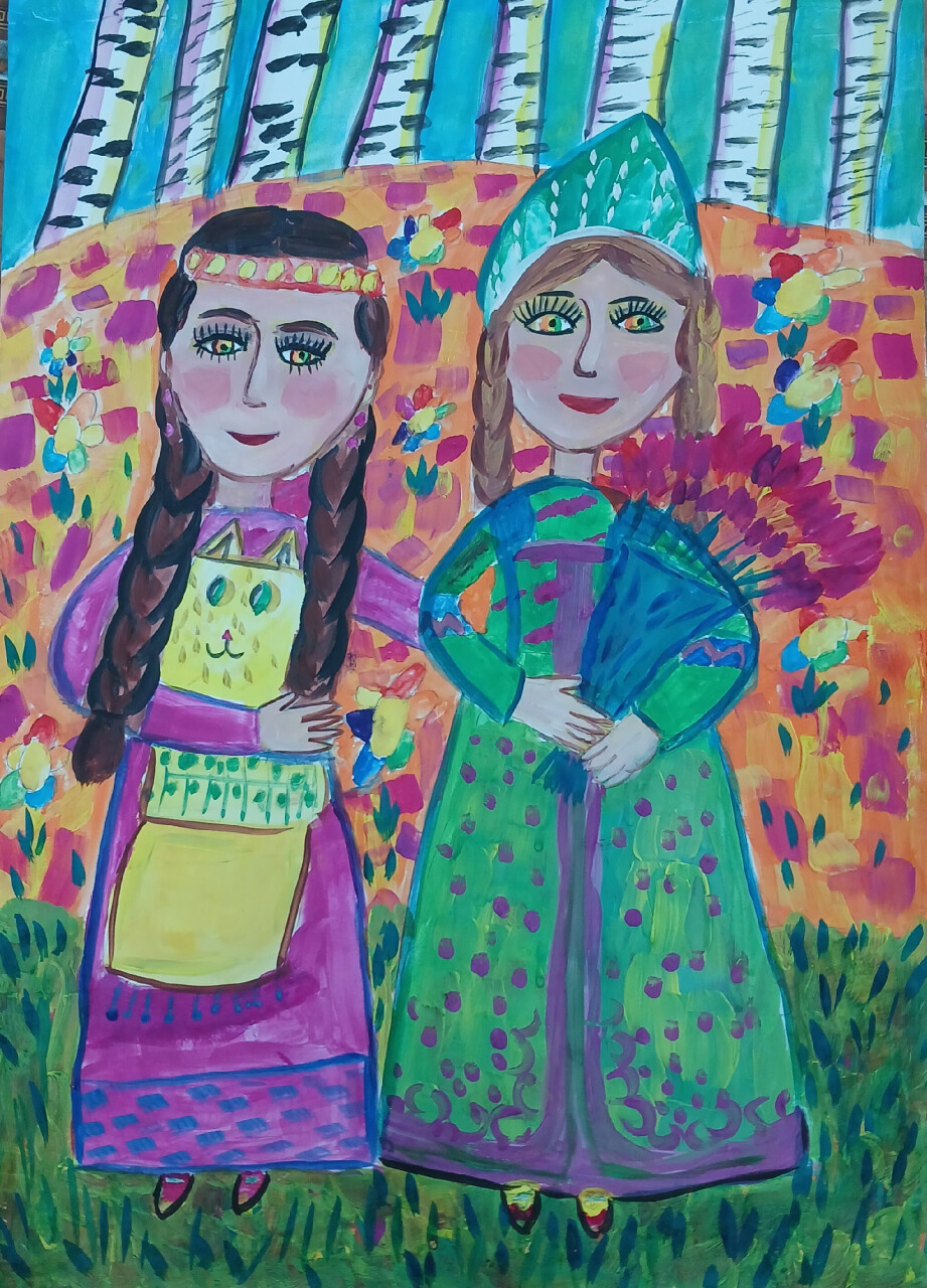 Мамы в национальных костюмах, русская и башкирка. Гуашь 2025