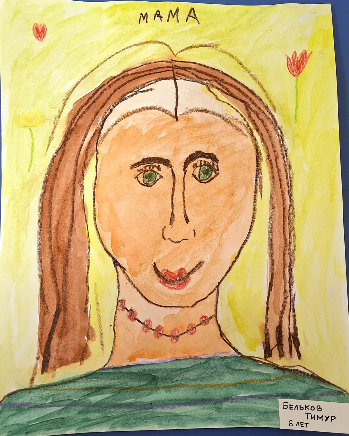 Работа выполнена масляной пастелью и акварелью на ватмане формата А3. Ребенок изобразил свою маму.