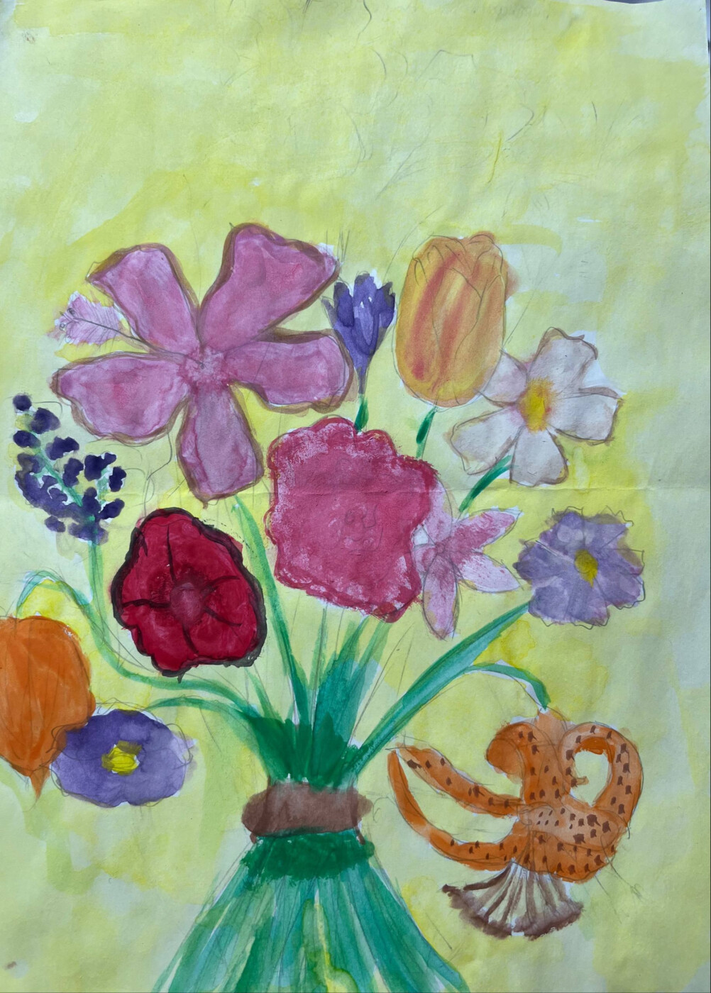 Этот рисунок посвящен самой дорогой женщине — маме. Букет цветов символизирует любовь, благодарность и уважение, которые дети испытывают к своим матерям каждый день. Цветовая гамма и композиция подчеркивают нежность и тепло материнской заботы. Каждый цветок уникален, как неповторима каждая мама, и вместе они создают гармонию, отражающую семейное счастье и уют домашнего очага.