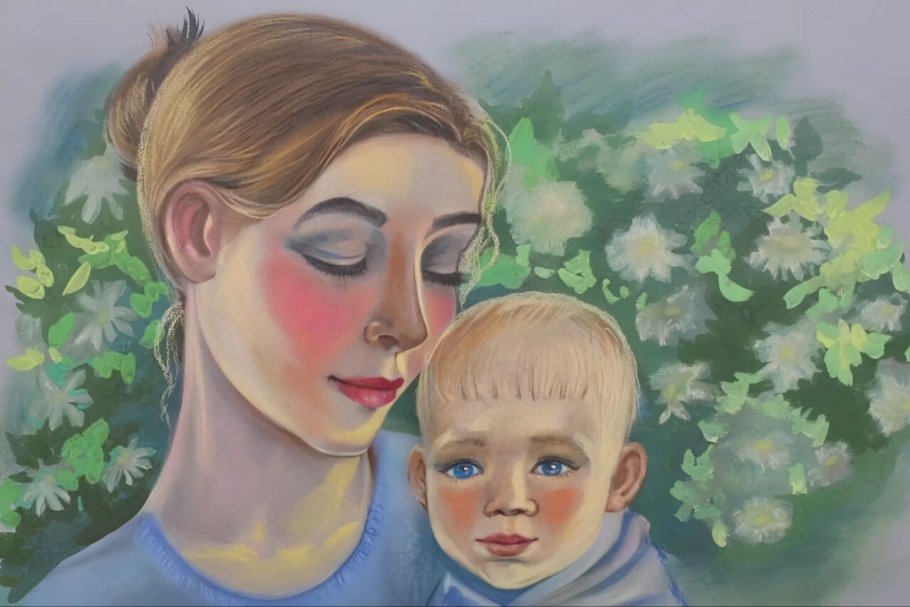 На этом рисунке я изобразил нежный момент между матерью и ребенком. Женщина с закрытыми глазами и спокойным выражением лица символизирует материнскую любовь и заботу. Ребенок смотрит на зрителя с любопытством и доверием, что подчеркивает его открытость миру. Фон картины выполнен в мягких зеленых и голубых тонах, создавая атмосферу умиротворения и гармонии. Цветы на заднем плане добавляют композиции свежести и естественности. Я старался передать через этот рисунок тепло и нежность, которые связывают мать и ребенка.