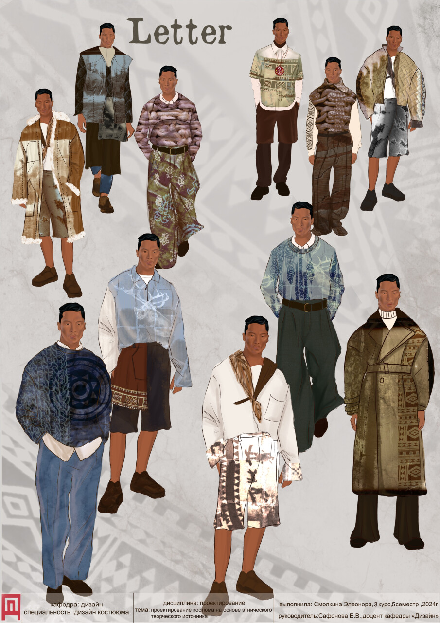 Коллекция совмещена с этникой и стилем кэжуал. Вместо вязания свитеров(джемперов) используется фотопечать с фактурой.
