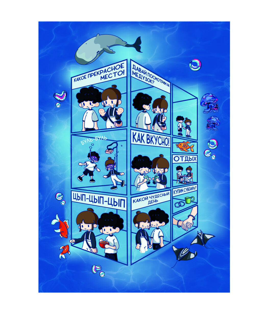 Название работы "Свидание в океанариуме". Описание: обычное свидание в океанариуме, но вопрос только в том: кто именно заключен в клетке? Вся работа выполнена в программе Adobe Illustrator. При работе использовались инструменты: перо и кисть. С помощью пера был построен каркас кубов, с помощью кисти - персонажи, животные, заливка фона и самих персонажей. В самом конце было выполнено наложение текстуры воды для придания реалистичности нахождения в ней.