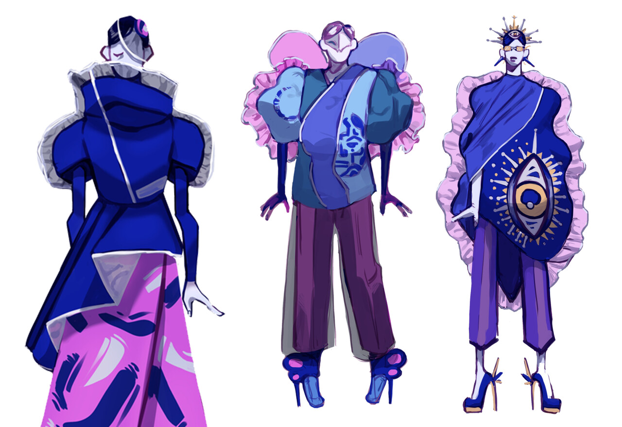 Размеры костюмов преувеличены за счет объемного наполнителя, это придает образам большую масштабность. Прозрачный ореол вокруг костюмов, созданный из легких материалов, похож на свечение звезд. Цвета тёмно-синий, фиолетовый, серебристый, ассоциирующиеся с космосом, часто используются в научной фантастике для создания атмосферы таинственности и загадочности.