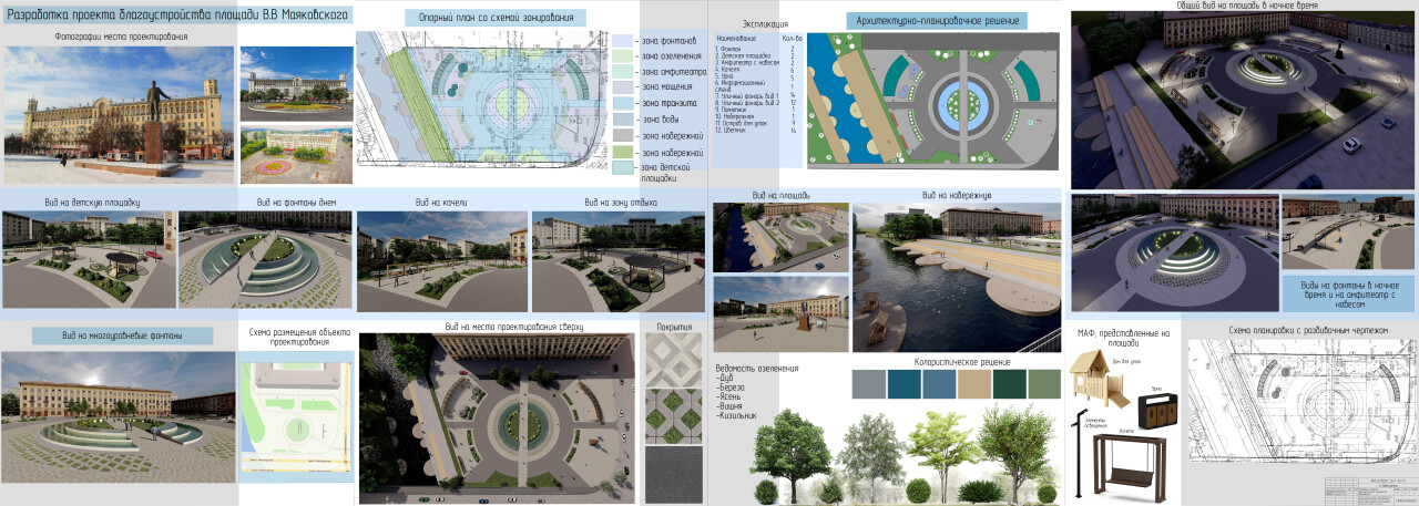 Концепция проекта представляет собой организацию многофункционального общественного пространства. На данной территории можно осуществлять социальное общение всех групп населения, совмещать активный и спокойный отдых, а также доступен подход к воде для кормления уток. Художественная и колористическая концепция основана на применении естественных и природных оттенков в отделке элементов благоустройства и мощениях площади, за основу взяты синий, зеленый и бежевый. |