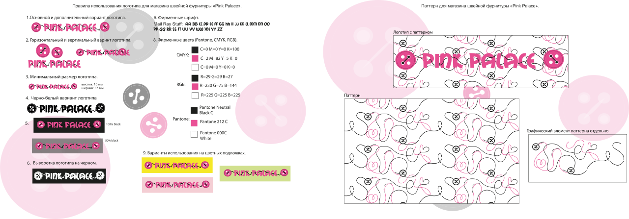 Логотип швейной фурнитуры "Pink Palace" вдохновлен мультфильмом "Коралина в стране кошмаров", целью его создания является желание привлечь потенциального покупателя и творческого человека. Представленные правила логотипа и паттерн помогут для разработки и оформления рекламной продукции и сайта данной компании.