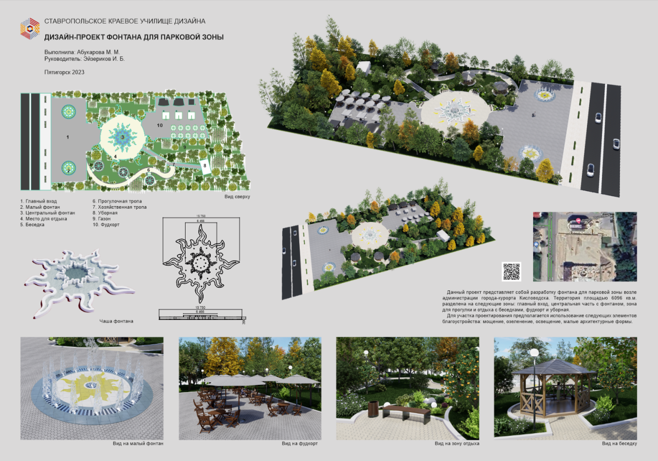 Данный проект представляет собой разработку фонтана для парковой зоны возле администрации города-курорта Кисловодска. Территория площадью 6096 кв. м. разделена на следующие зоны: главный вход, центральная часть с фонтаном, зона для прогулки и отдыха с беседками, фудкорт и уборная.