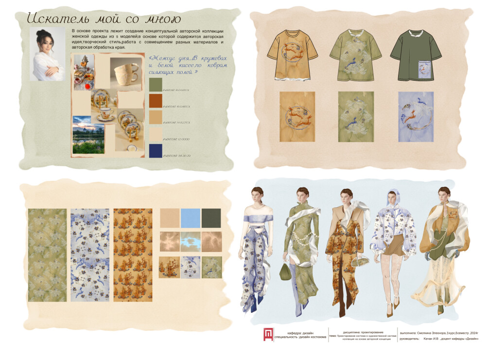 В основе проекта лежит создание концептуальной авторской коллекции женской одежды с прочтением руссского кода через роспись по посуде(Дымовская роспись) в основе которой содержится авторская идея, творческий стиль, работа с совмещением разных материалов и авторская обработка края.