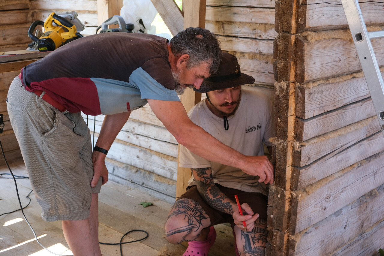 На этом снимке два опытных мастера, сосредоточенно работающих над восстановлением старой часовни. Их руки уверенно касаются древесины, они не просто работают с материалом — они возвращают к жизни историю.