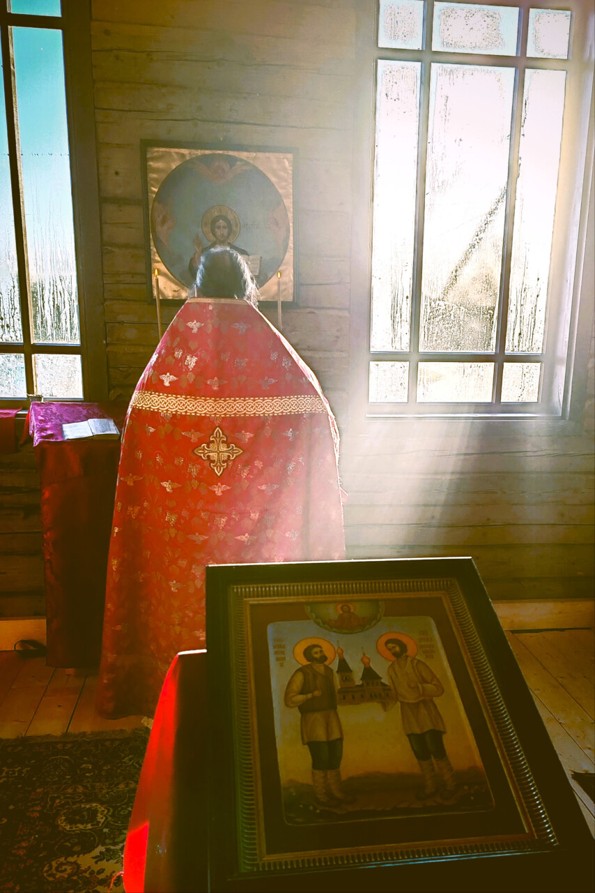 На фото 09.11.2024 г.: первую литургию в отреставрированной и собранной в д. Никулино Спировского района Тверской области часовни в честь и память святых мучеников Петра Жукова и Прохора Михайлова* служит протоиерей Димитрий Лихачев.