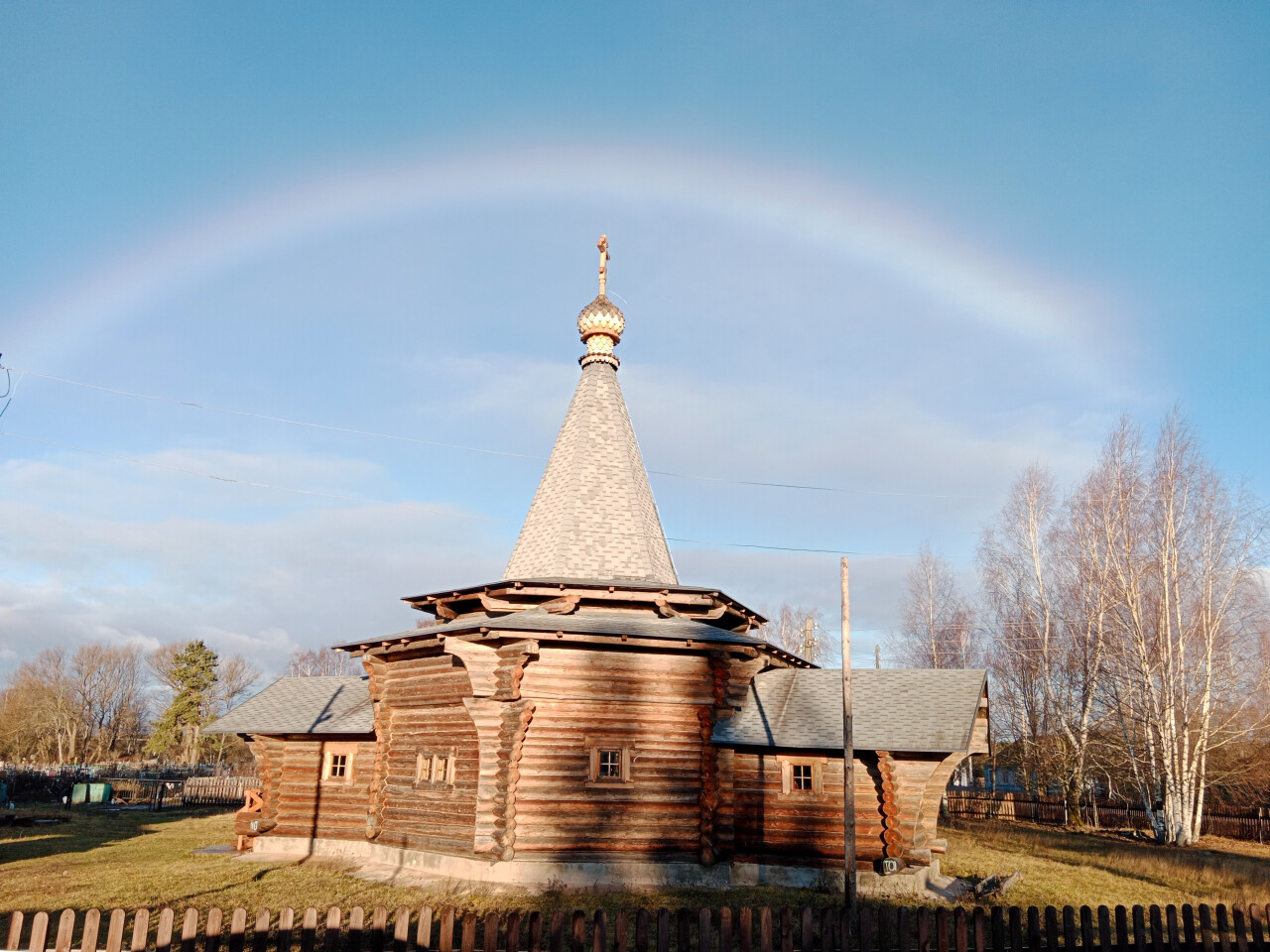 Храм Алексия Сибирского срублен участниками проекта Наследие в память о подвиге новомученика. Фото сделано 13 ноября 2022 года во время литургии в память святого. Возглавил праздничную службу епископ Бежецкий и Удомельский Филарет. Стало традицией участников проекта Наследие приезжать в ноябре в Козлово и участвовать в Свято - Алексеевских чтениях и праздничных мероприятиях посвященных памяти новомученика. Фото сделано на обычный телефон, но в целом передает цветопередачу. Вокруг храма не обычная радуга, а арка из белых облаков. Такие чудеса не редкость в Козлово в день памяти Алексия Сибирского.
