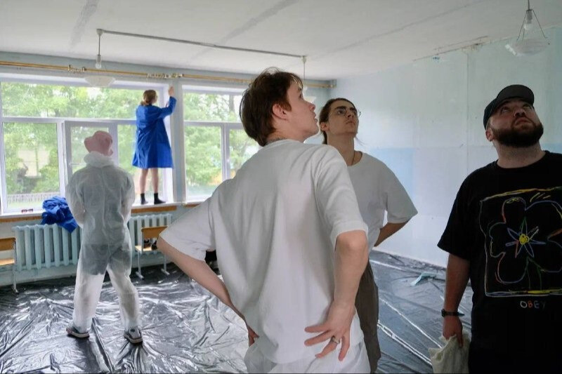 На изображении показана группа людей в комнате, покраску стен. Они заняты какими-то ремонтными работами. Комната выглядит как обычное помещение с большим окном. На полу расстелена пленка, возможно, для защиты от грязи или краски. Виден радиатор отопления под окном. В окне видны деревья. Преобладают нейтральные и светлые тона, такие как белый и серый. Некоторые люди одеты в белую одежду. Один человек в синем халате стоит у окна. Пол покрыт черным или темно-серым пластиком. Сложно однозначно определить эмоции. Позы людей говорят о заинтересованности и концентрации на потолке. Нет явных признаков счастья, грусти или злости. Разнообразная группа людей разного возраста. Их лица не очень четкие, но можно заметить, что они смотрят вверх. У одного человека надета кепка. На потолок обращено основное внимание. Возможно, он находится в процессе ремонта. Видно, что пол тщательно укрыт пленкой, что говорит о проводимых работах. Большое окно, через которое проникает естественный свет. В окне видны зеленые деревья. Изображение создает впечатление активного ремонта или подготовки к строительным работам. Люди выглядят заинтересованными и сосредоточенными на своей задаче. Комната кажется обычной и функциональной, без каких-либо особых украшений.