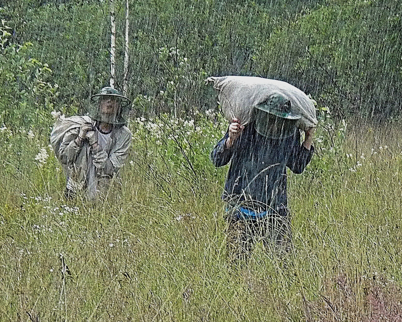 Брать мох решили на болоте между с. Козлово и аэродромом. Ну и, как это бывает, когда ребята возвращались с полными мешками прекрасного свежесобранного экологически чистого мха – начался ливень. Я-то снимал из машины, а вот они вымокли до нитки.