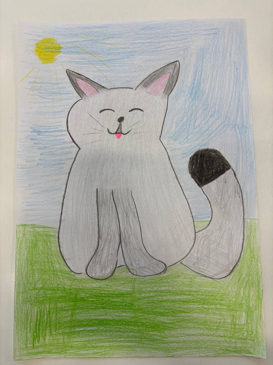 Работа выполнена с помощью простого карандаша, цветных карандашей. На картине изображён домашний питомец ребенка- серый кот. Он сидит на полянке и греется на солнышке под голубым небом
