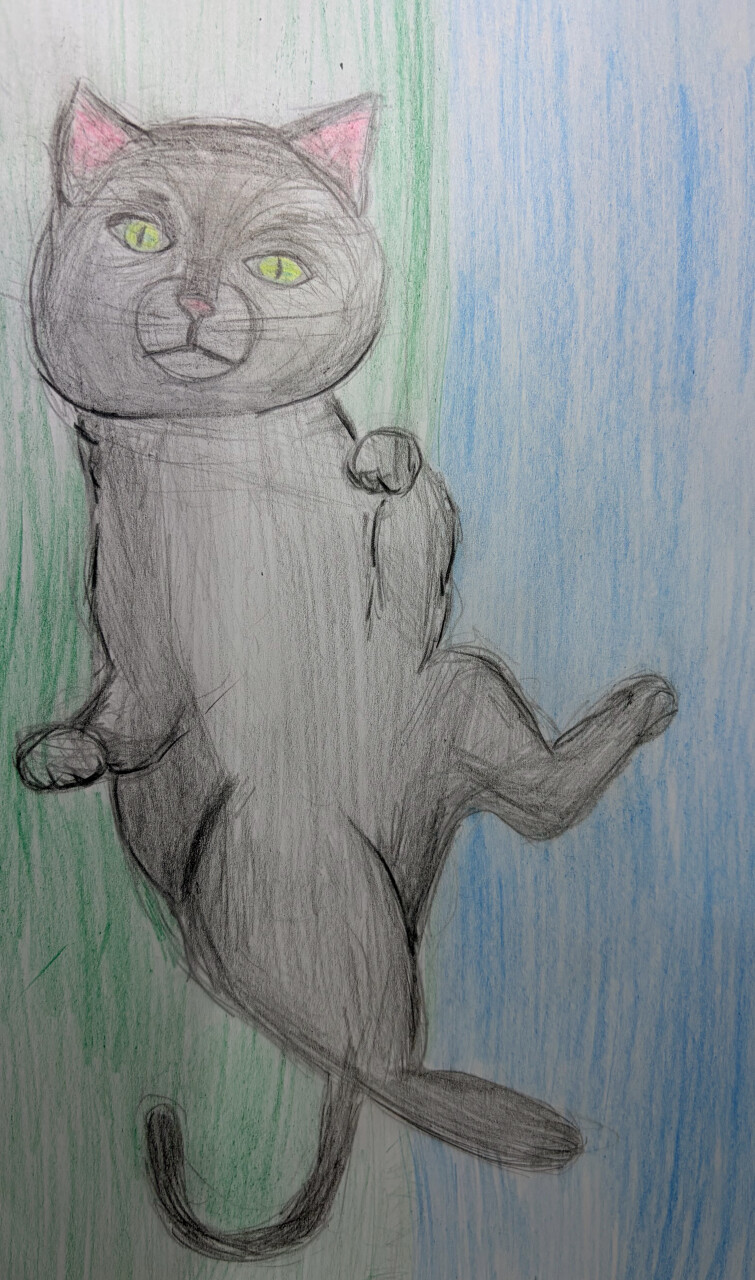 Название работы „Мой кот". На рисунке изображен мой кот ,лежащий на траве . Его зовут Нурик. Два года назад , мы с папой, нашли котенка выброшенным на улицу. Нам стало его жаль и мы принесли его домой.