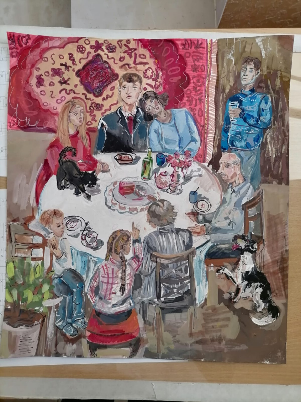 Работа выполнена на тему "Семья в советское время", произведение выполнено гуашью