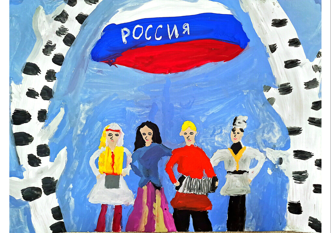 На рисунке изображены совершенно разные люди в традиционных костюмах, стоящие на фоне берез и российским флагом. Работа передает идею дружбы и единства народов нашей любимой страны, а также уважения к многоликой культуре