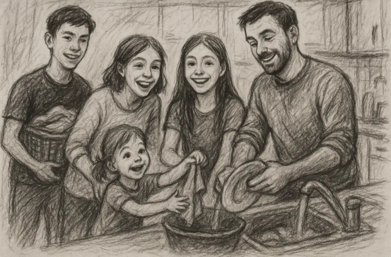 Моя семья занимается домашними делами вместе.