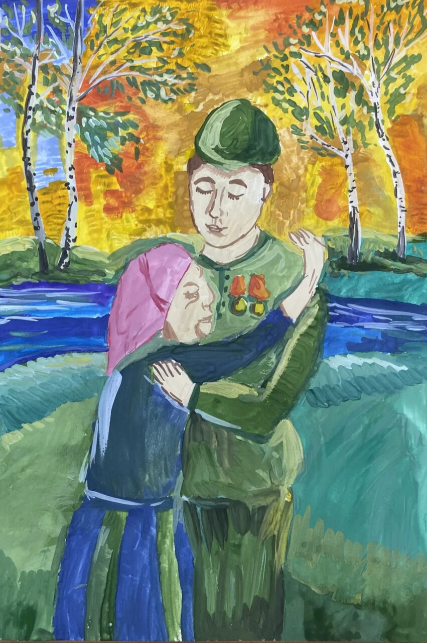 Болоткова Элисса, 10 лет. Возвращение с войны. Материал гуашь. Номинация живопись. Формат работы А3. Педагог Гришачкова Елена Владимировна