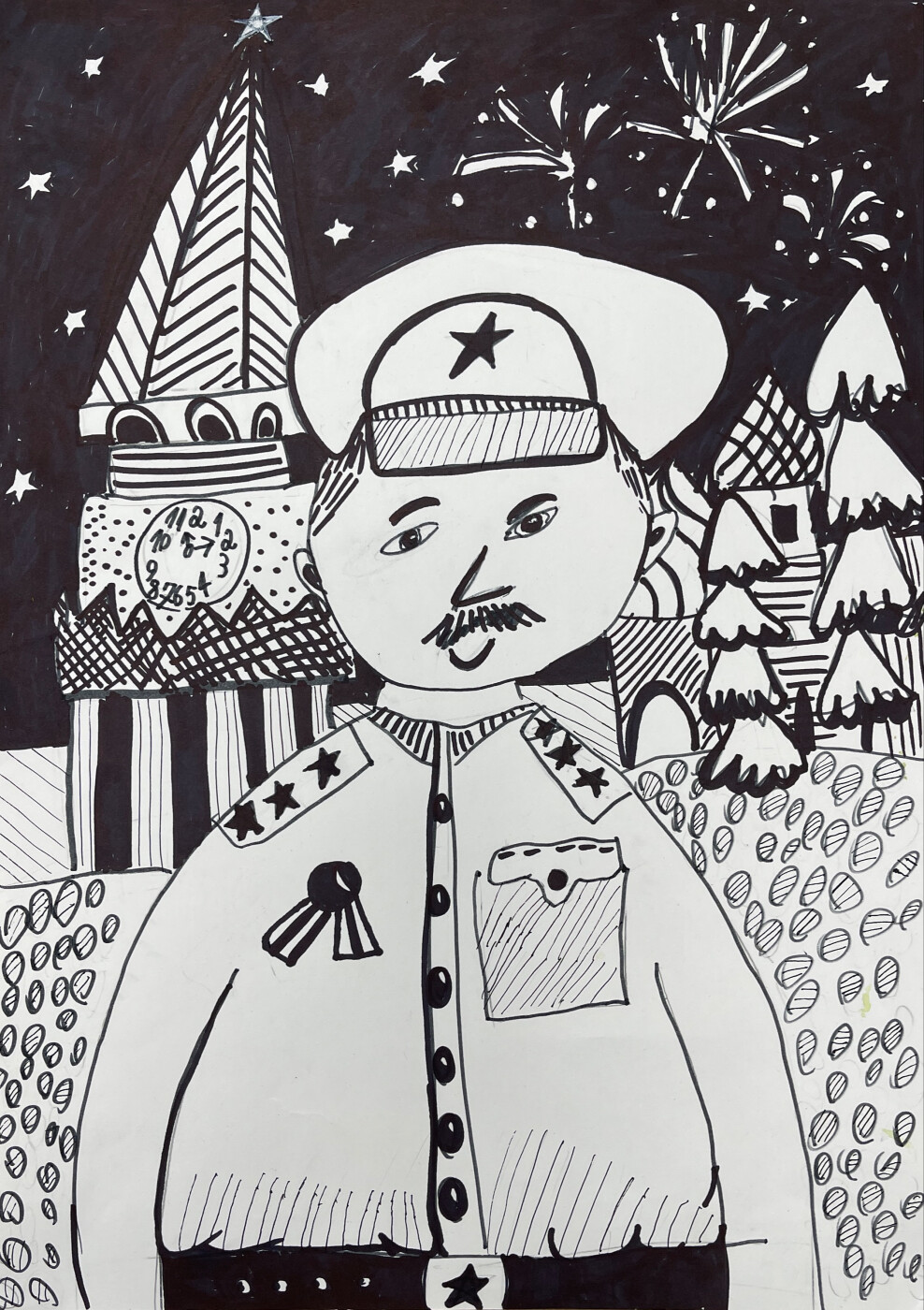 На творческой работе изображен герой Великой Отечественной войны, который дошёл до Победы! Сражался и защищал нашу Родину. Парад Победы и салют на Красной Площади встречает его.