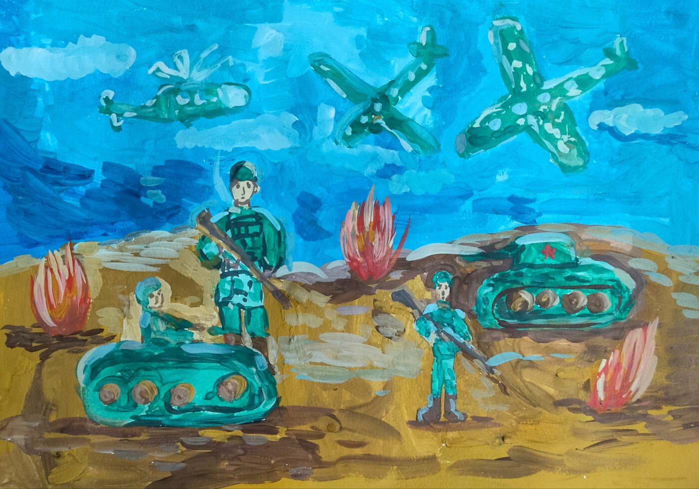 Гладков Михаил, 8 лет, Идёт бой, материал гуашь. Формат работы А3, номинация живопись. Педагог Гришачкова Елена Владимировна