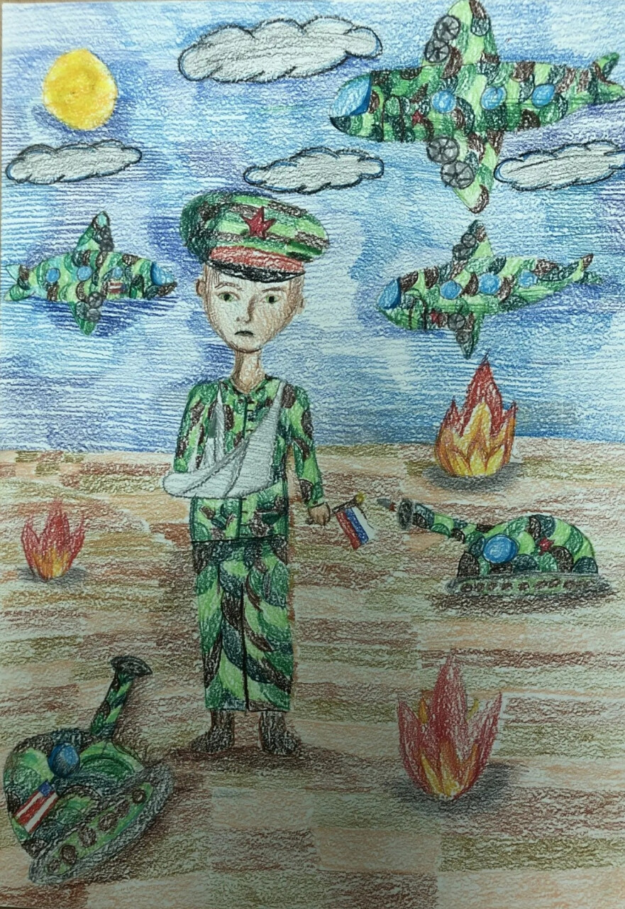 Сушенцова Кира. 10 лет. Солдат. Материал акварельные карандаши. Формат работы А3. Номинация графика. Педагог Гришачкова Елена Владимировна