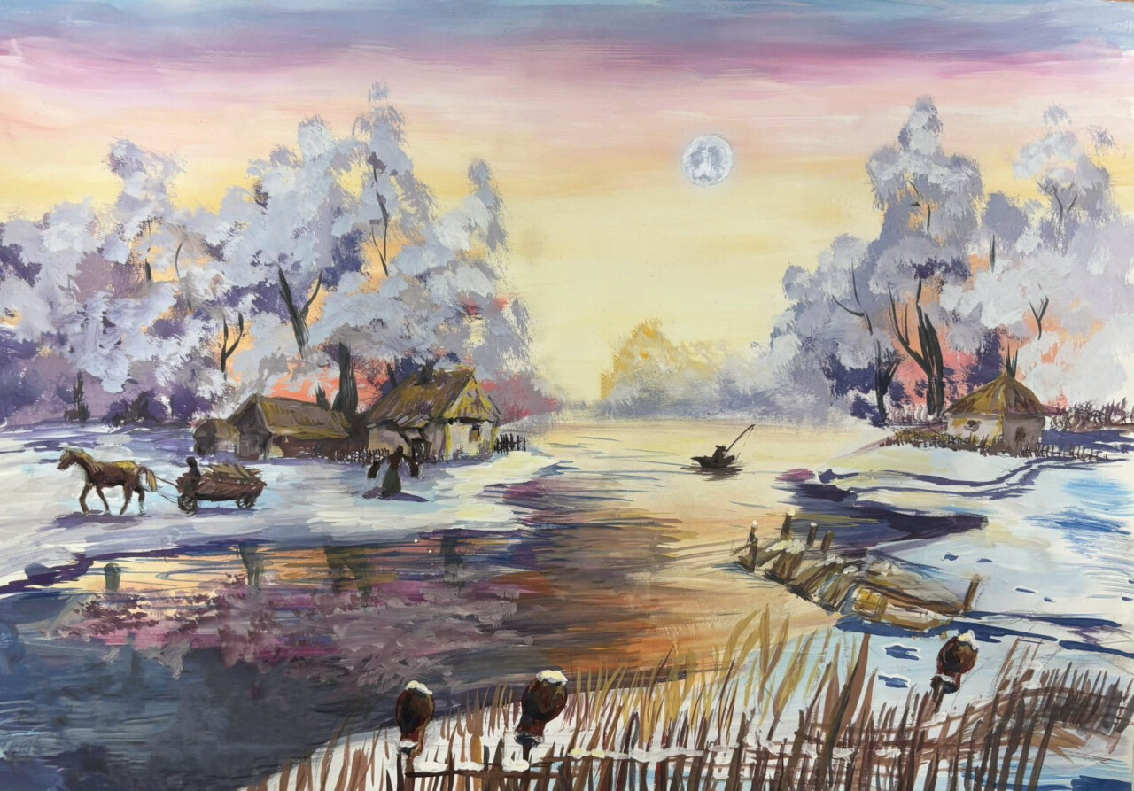"Зимний хутор у реки". Пейзаж отражающий быт казачества 19-20 вв. Написан в технике гуаши.