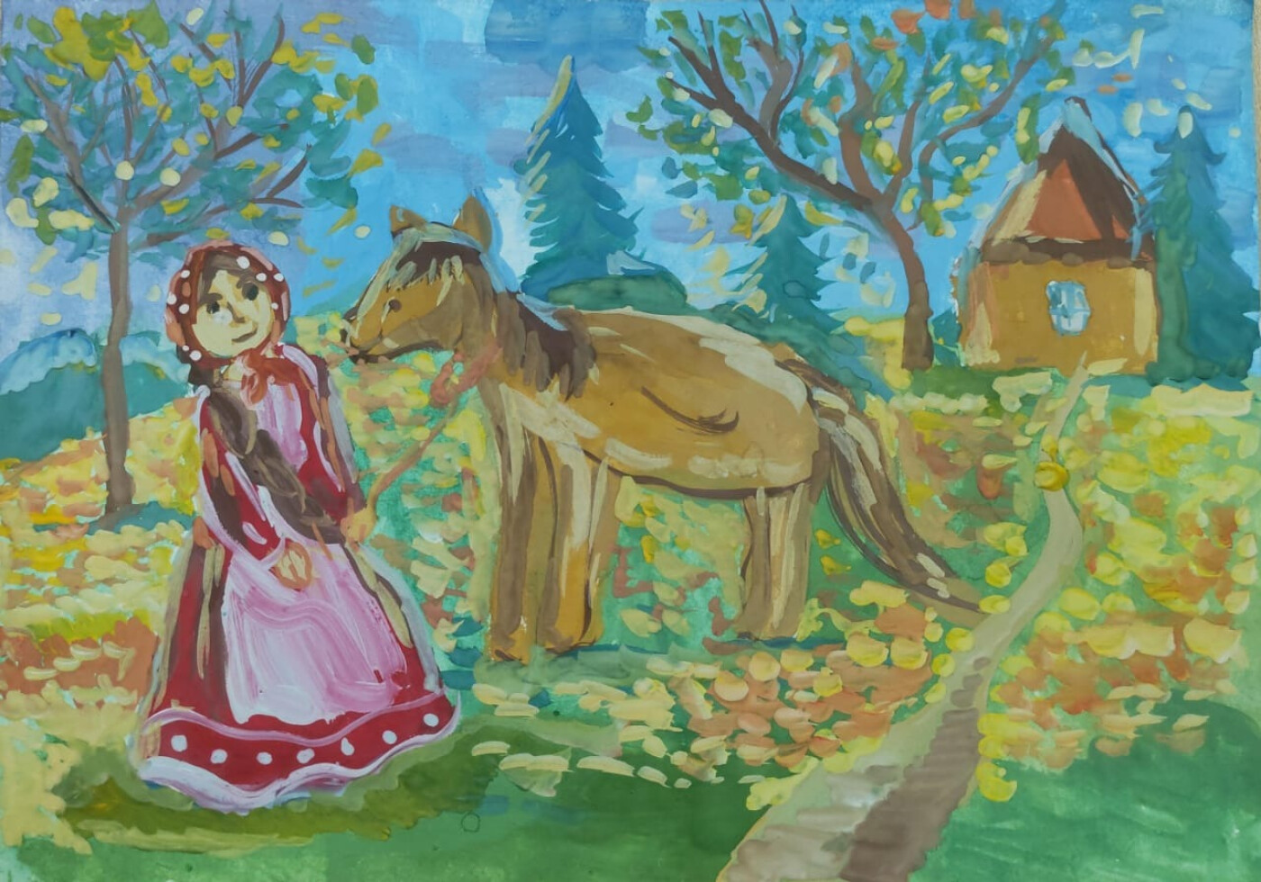 Гладков Михаил, 8 лет. Казачка с лошадью. Материал гуашь. Размер 210х297мм.