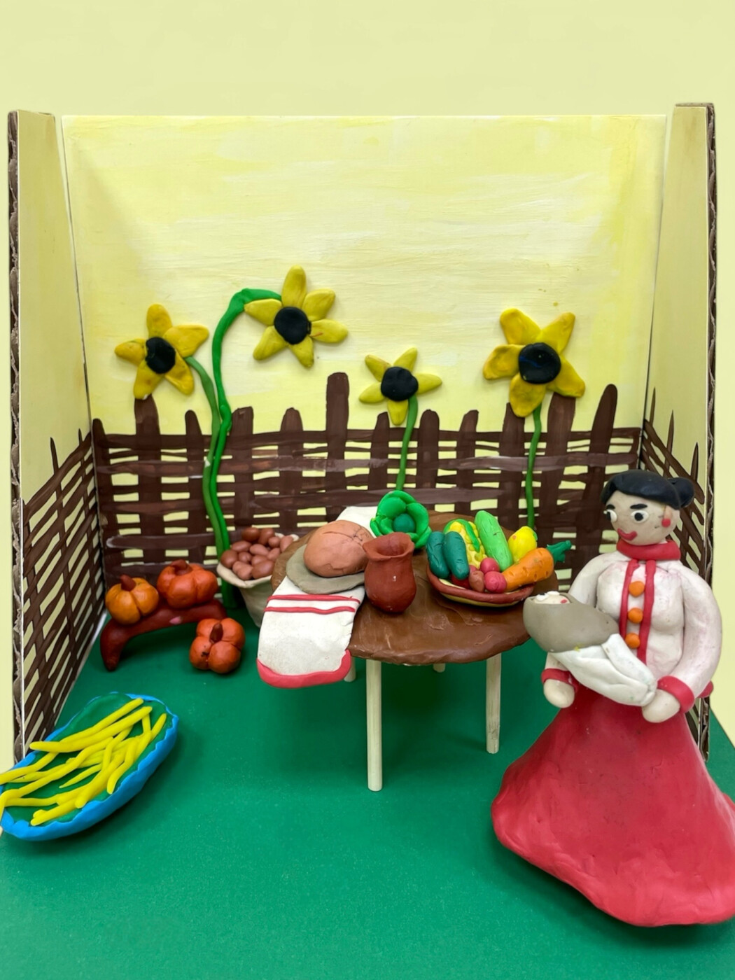 В данной поделке из пластилина изображена мать-казачка, нежно обнимающая своего ребенка. Она одета в традиционный казачий костюм, который символизирует силу и заботу. На столе можно увидеть осенний урожай. За ними виден уютный забор, украшенный подсолнухами. Эта композиция передает атмосферу домашнего уюта и семейных ценностей, отражая дух казачьей культуры и любовь к родной земле.