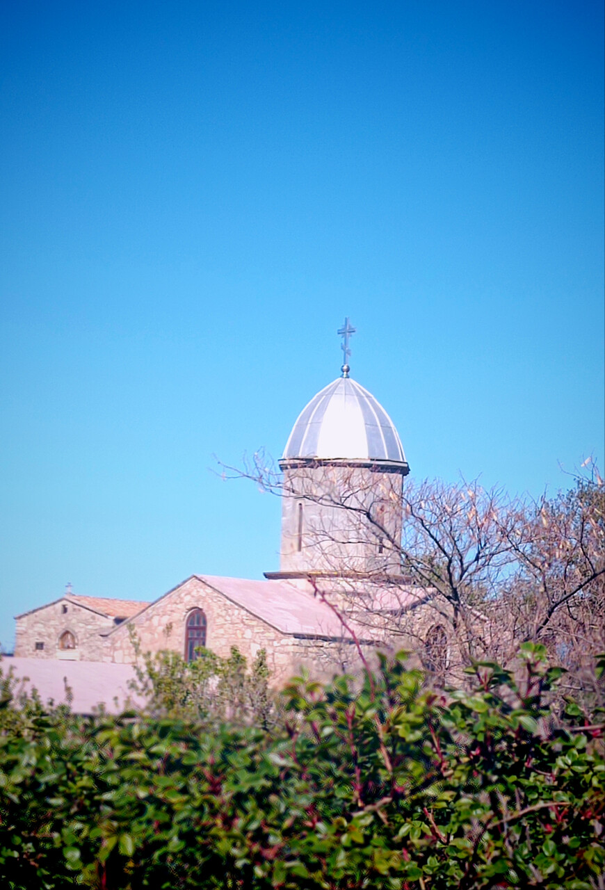 На фото церковь Иверской иконы Божьей Матери. Православный храм располагается по адресу: республика Крым, Феодосия. Портовая улица, д.16. Данное фото было сделано 28.04.25.