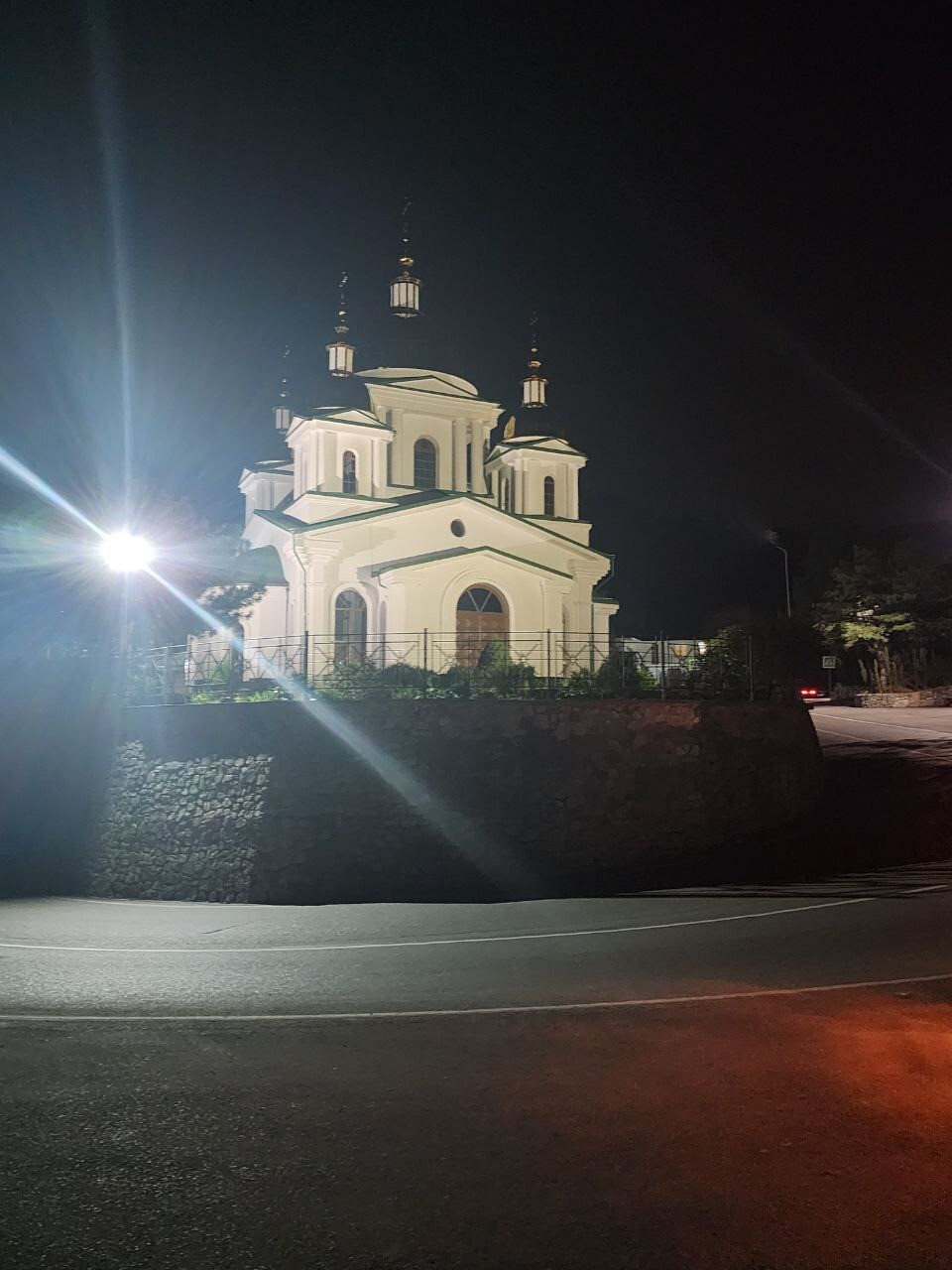 Это храм Святого Архангела Михаила в Крыму. Он стоит прямо у дороги и будто охраняет всех путников, которые едут мимо. Ночью он светится, как настоящий маяк среди тьмы. Мне кажется, что сам Архангел Михаил простирает над ним свои крылья, чтобы оберегать людей. Храм красивый, строгий и очень спокойный — как добрый рыцарь в свете фонарей.