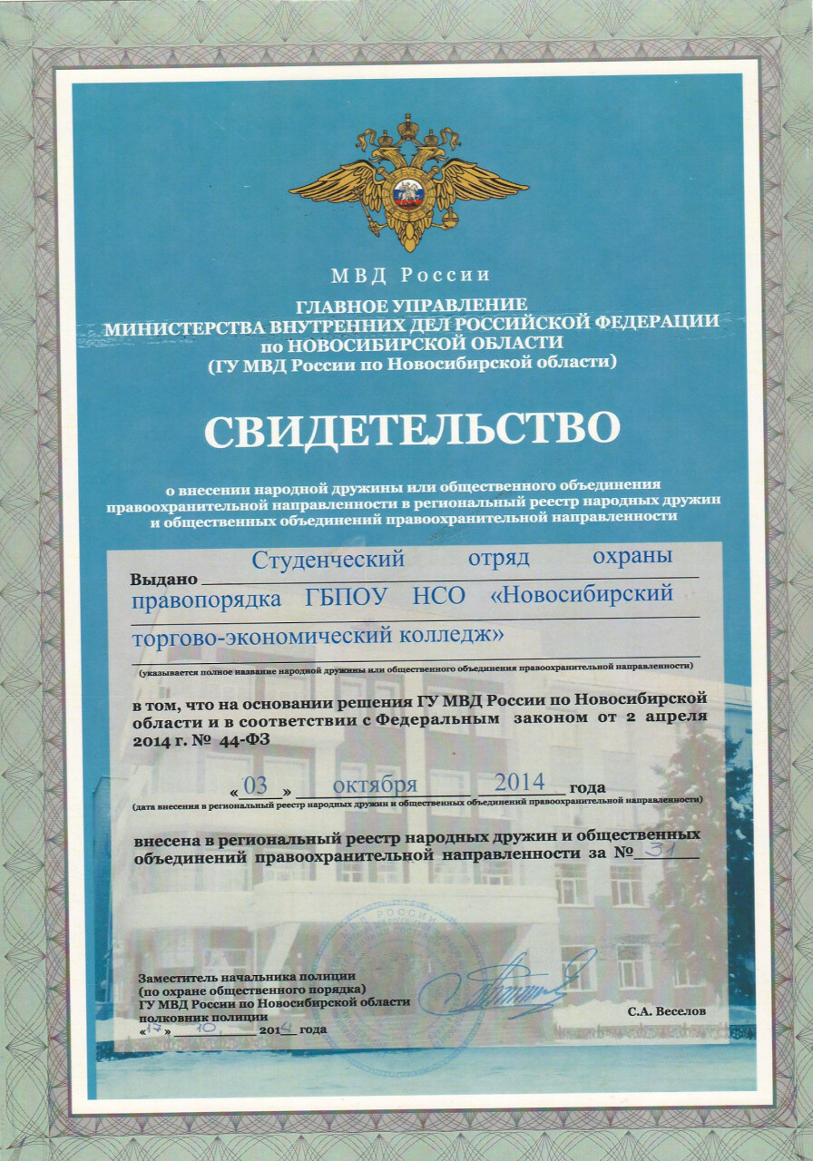 1) Создание ООПН (разработка Положения об ООПН (студенческий отряд охраны правопорядка) ГБПОУ НСО «НТЭК», получение свидетельства ГУ МВД России по Новосибирской области о внесении в региональный реестр народных дружин и ООПН № 31 от 03 октября 2014 г.