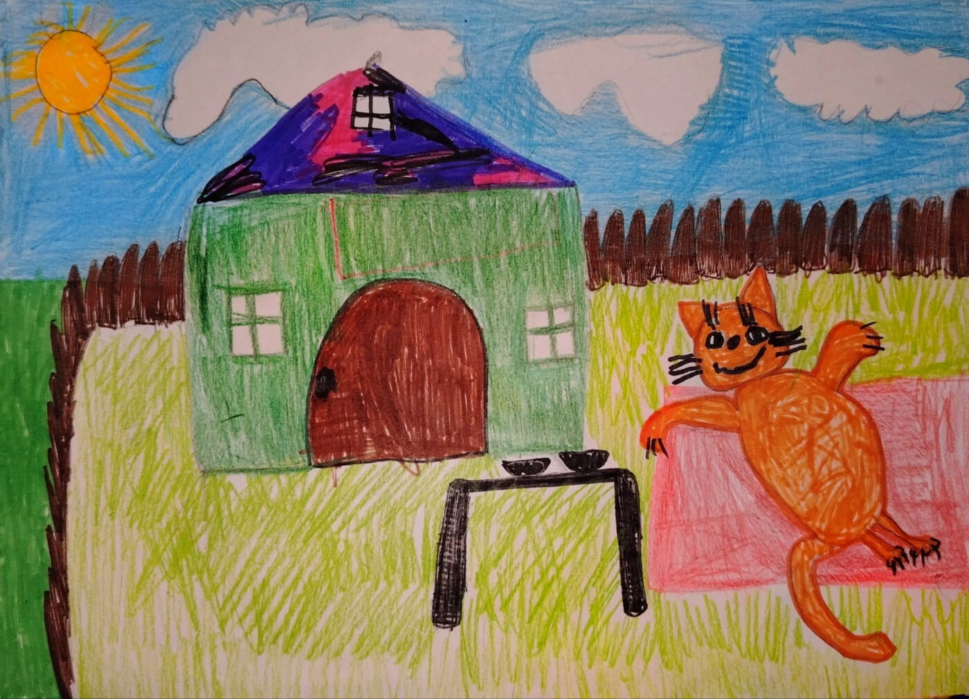 Дочь рассказала, что у кошечки муси дом должен быть таким же как у людей, с окошками и дверью. Муся вышла во двор полежать на коврике и покушать молочка из тарелочки.