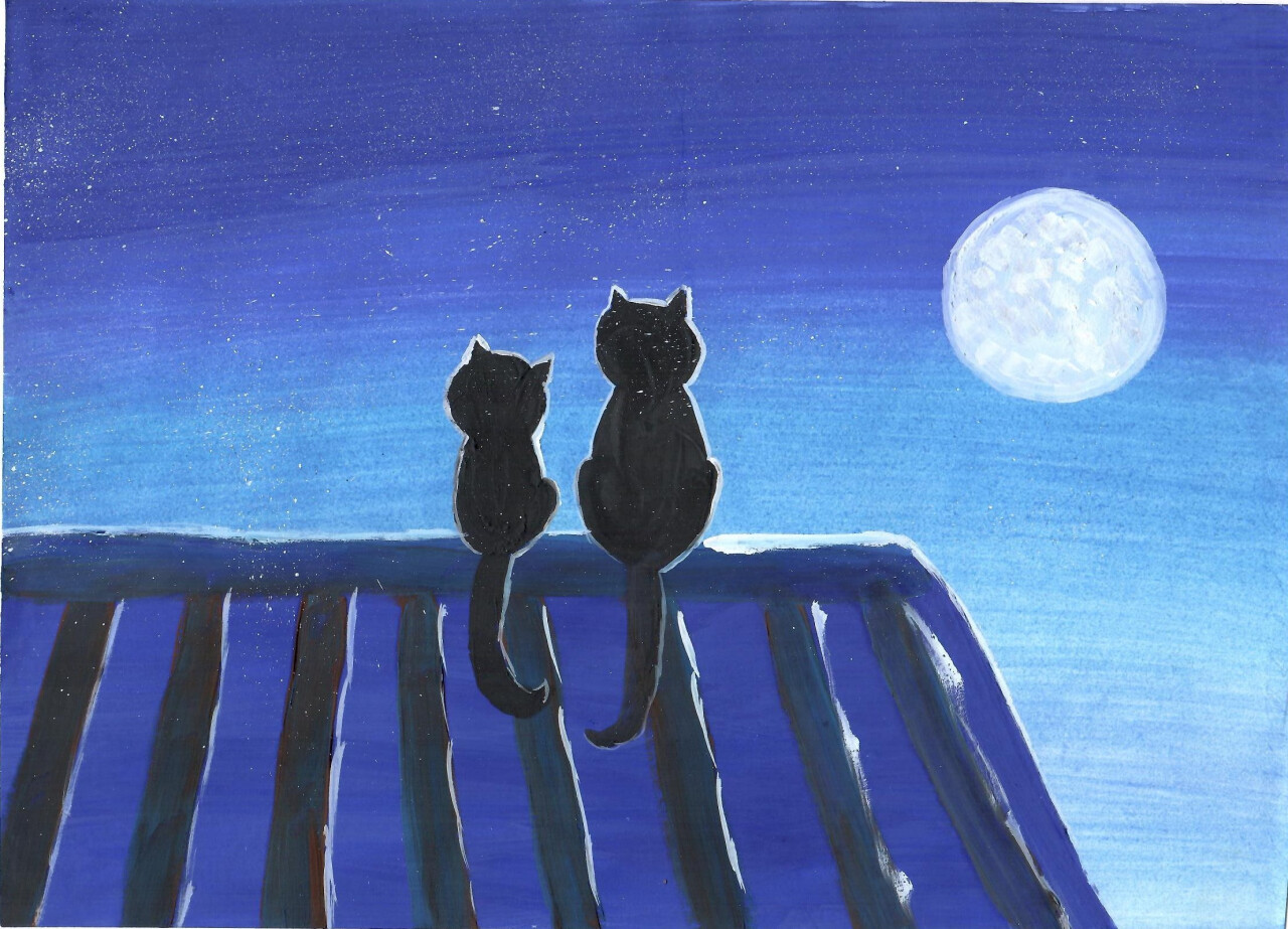 Рисунок гуашью. Коты на крыше ночью смотрят на Луну