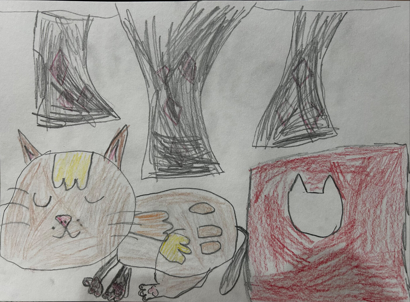 Маленькая кошечке тепло дома у штор и ее лежанкой.